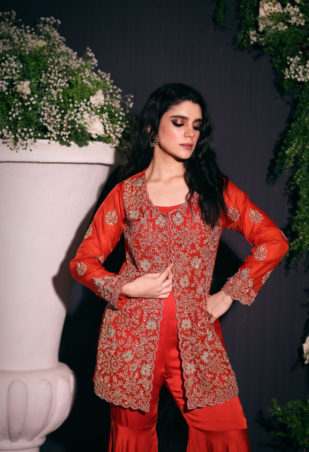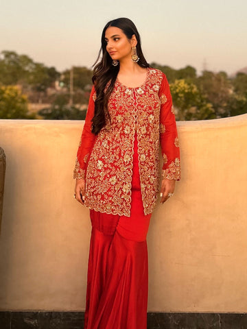 Heavy zari and resham hand embroidery organza jacket paired with satin sharara pants.Comprises: Bustier, Pant...