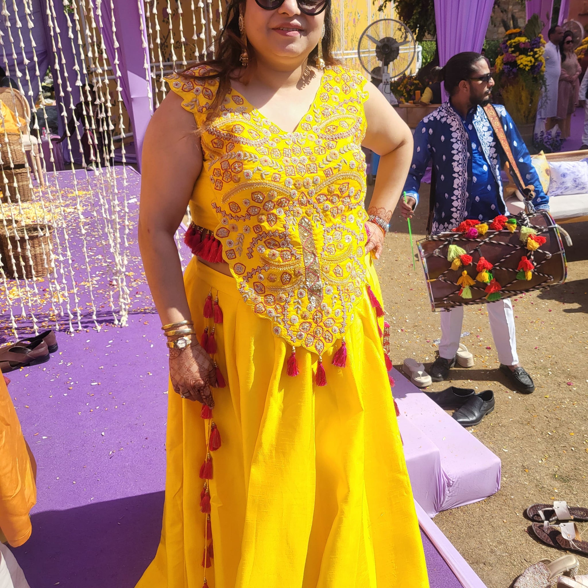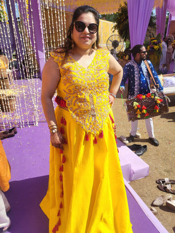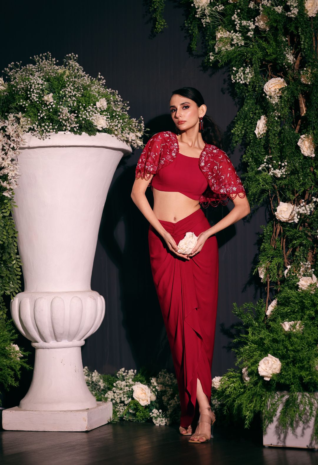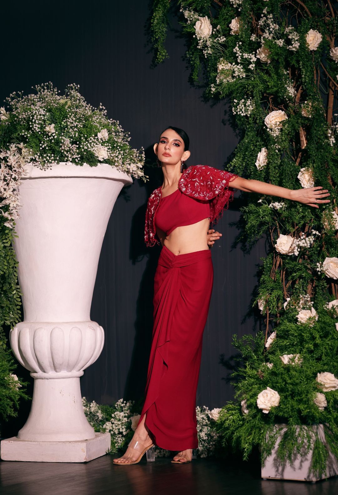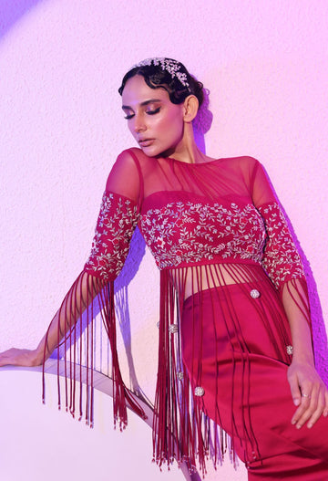 Organza shrug top with tassel detailing on the edge paired with a bustier and cowl...