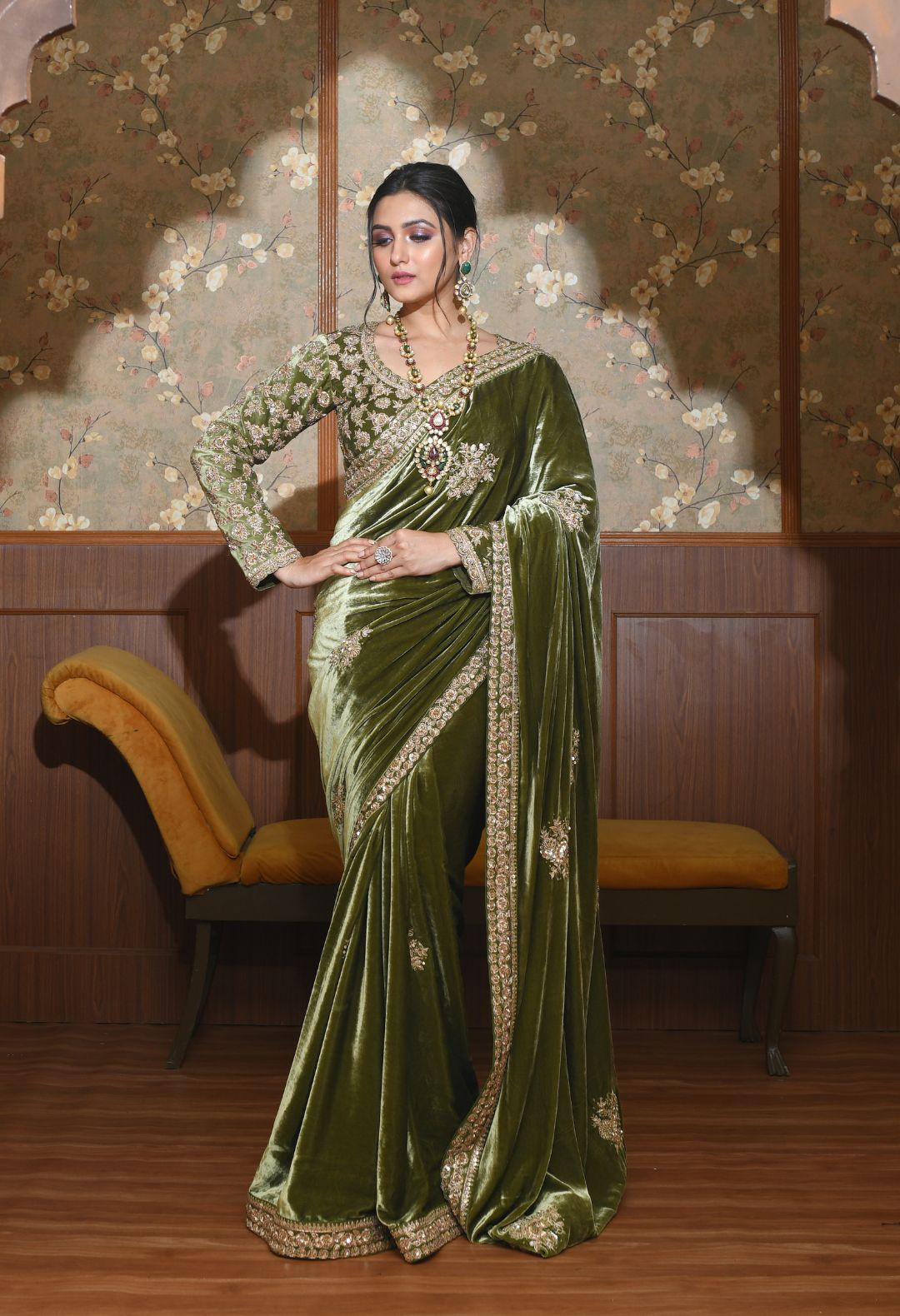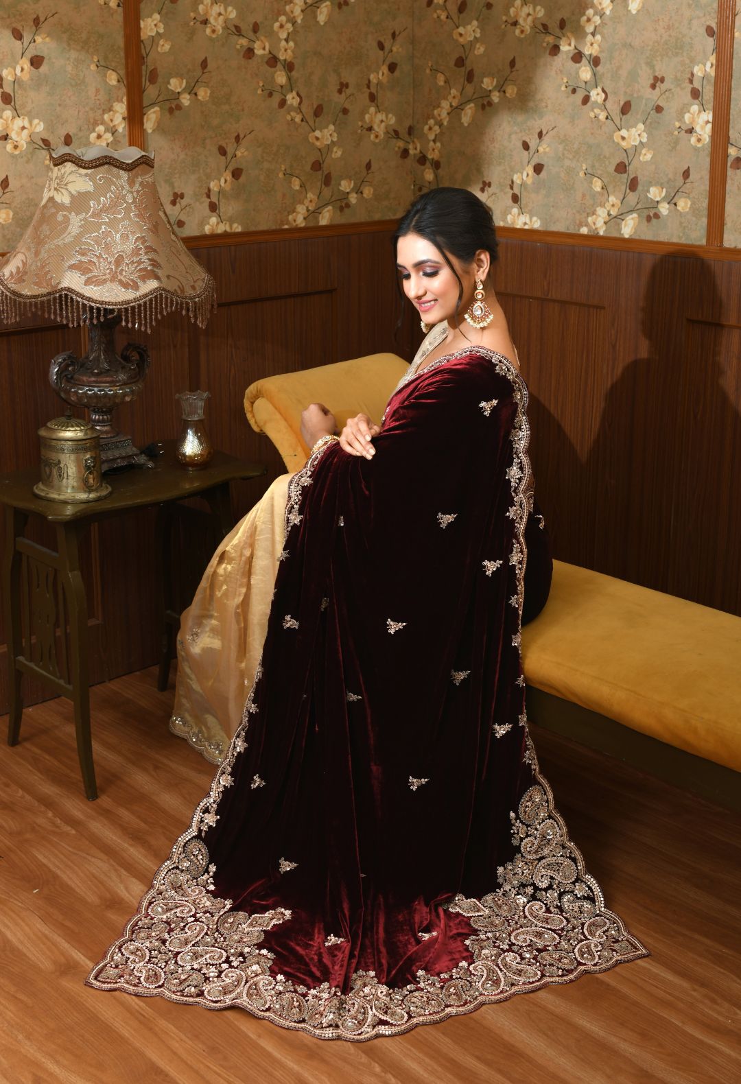Premium velvet saree with gold zardozi hand embroidered border and buta placement all over the...