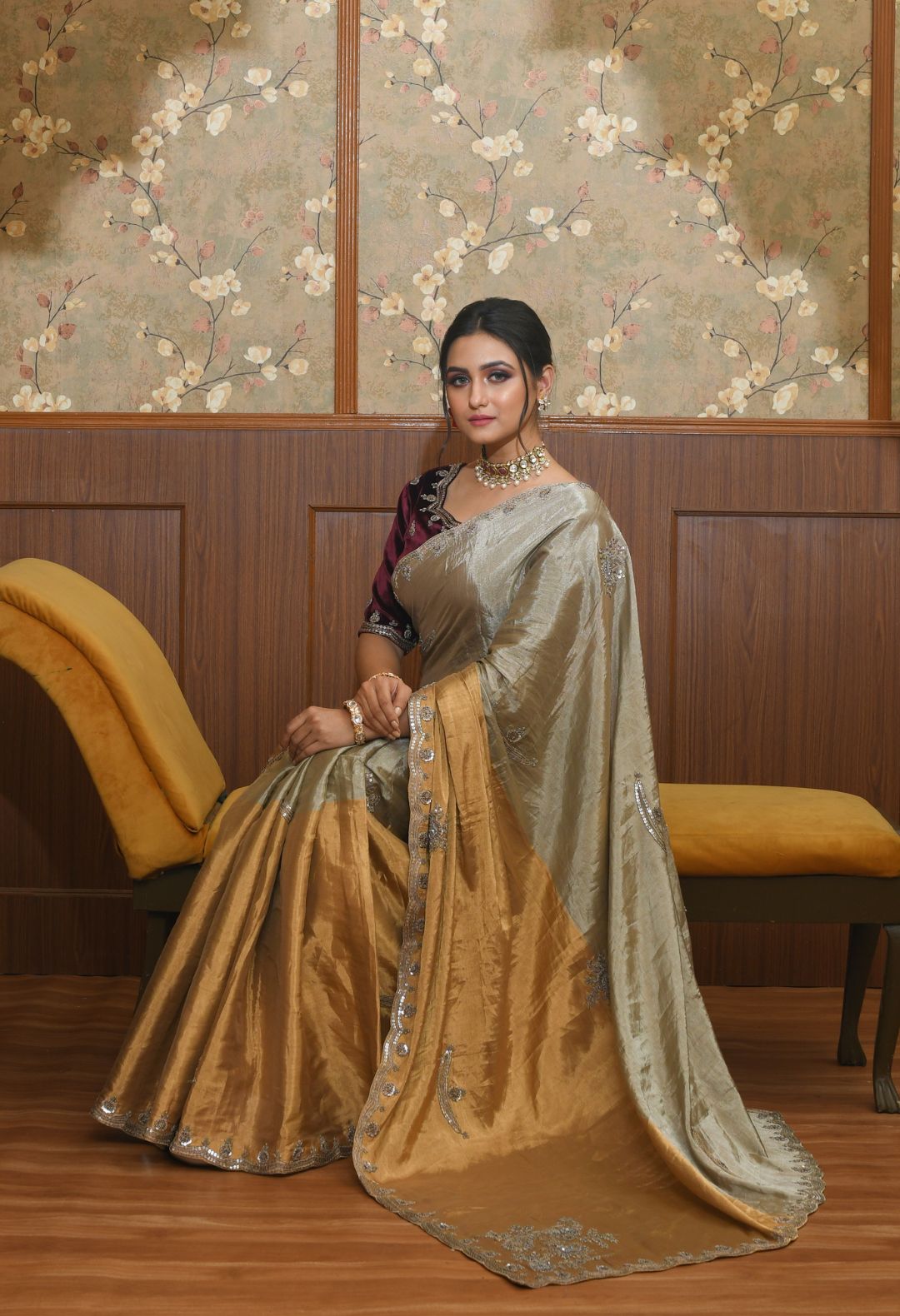 Gold and silver concept metallic saree with silver zardozi hand embroidery, paired with a contrast...