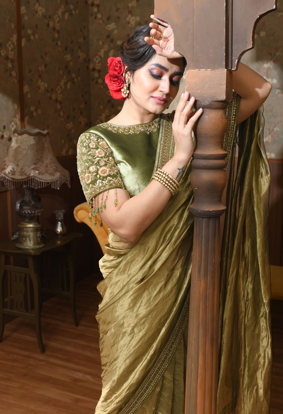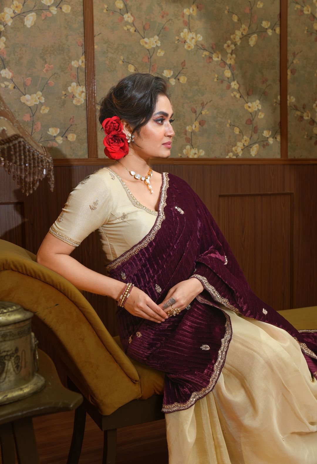 Tissue border saree paired with a monochromatic velvet blouse featuring heavy zardozi hand embroidery and...
