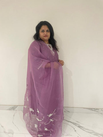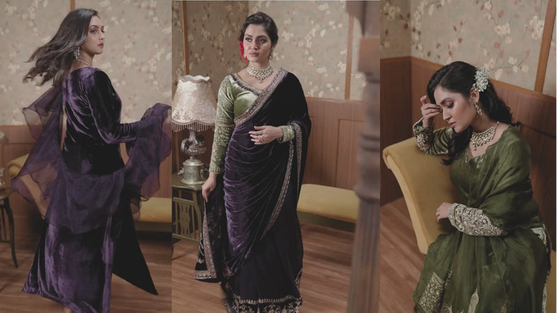 Premium purple half and half saree in organza and velvet with very intricate gold zardozi...