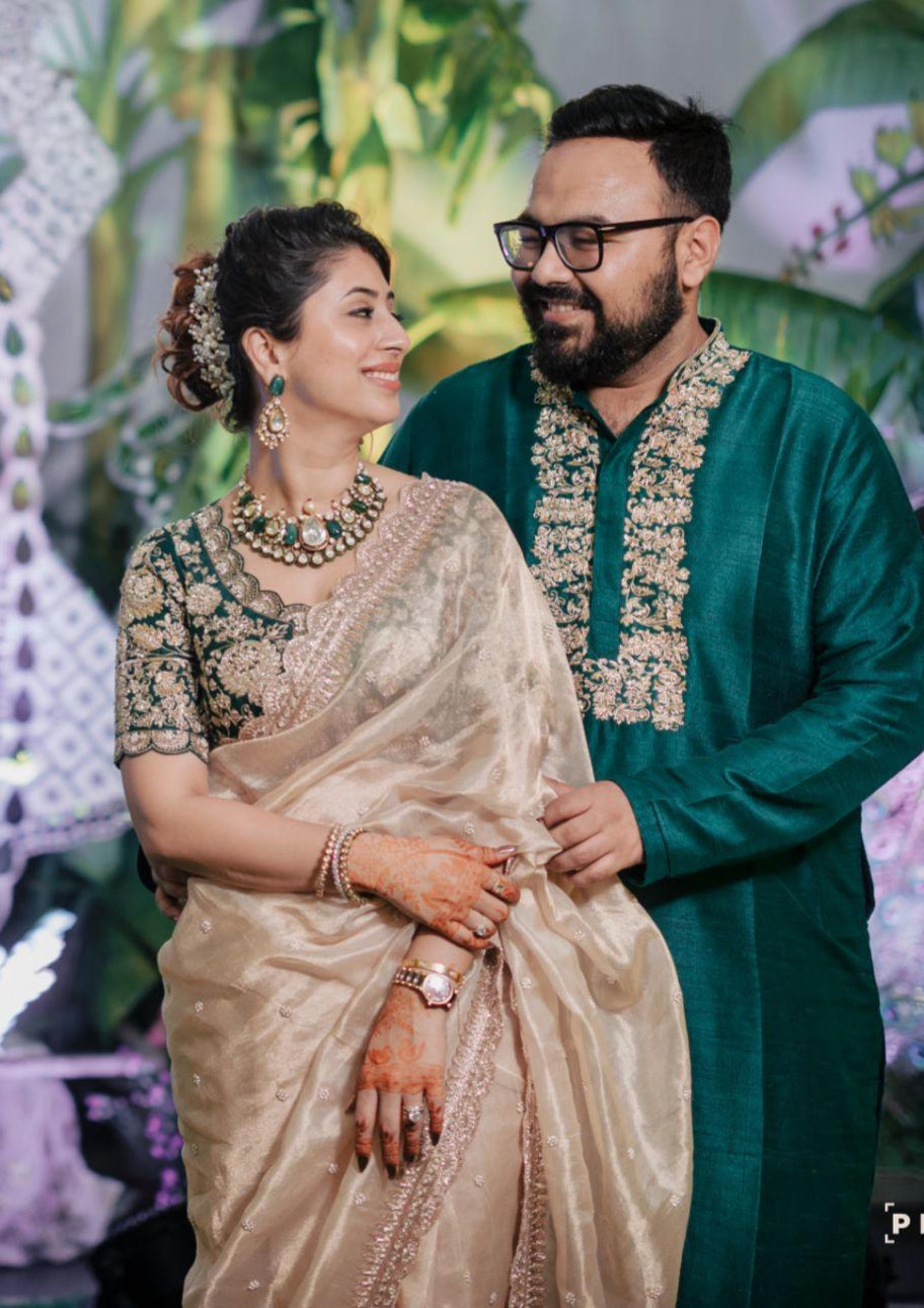 Gold tissue organza saree with intricate all over embellishment paired with a red statement blouse....
