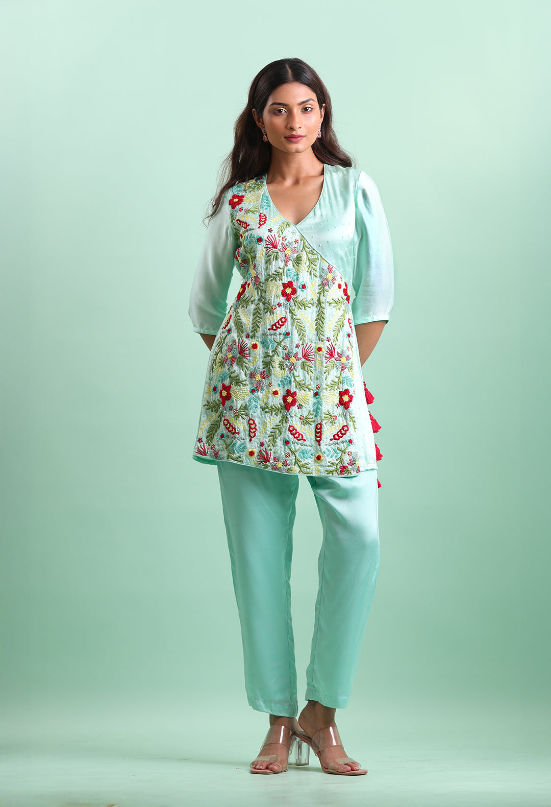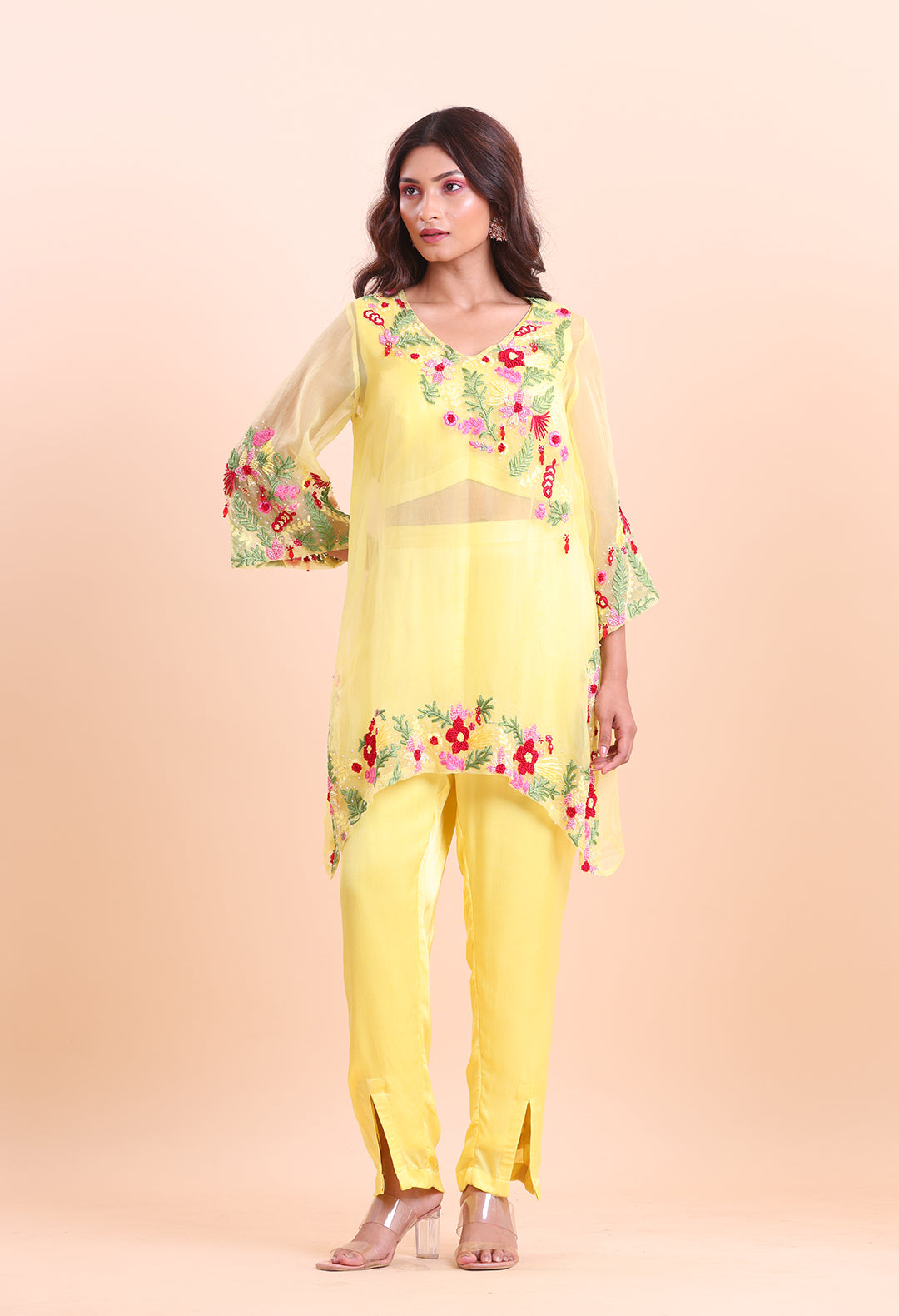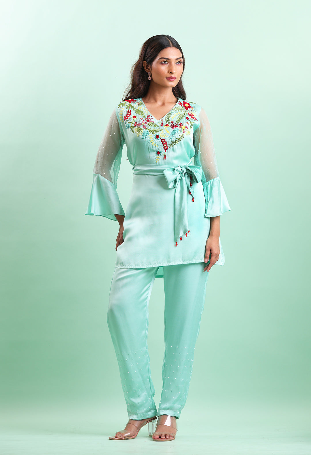 A stylish two piece coord set with intricate threadwork and pearls embroidery.Comprises: Top and PantsFabric:...