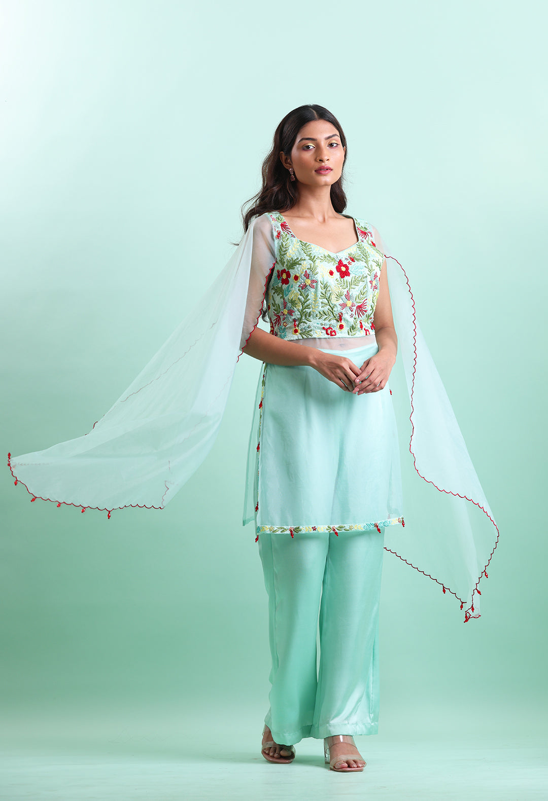 A stylish three piece coord set with intricate threadwork and pearls embroidery.Comprises: Tunic, Bustier and...