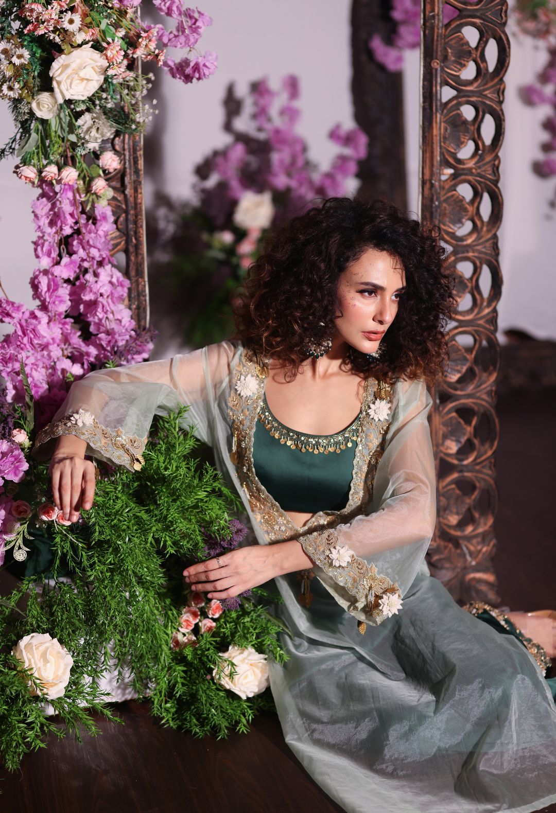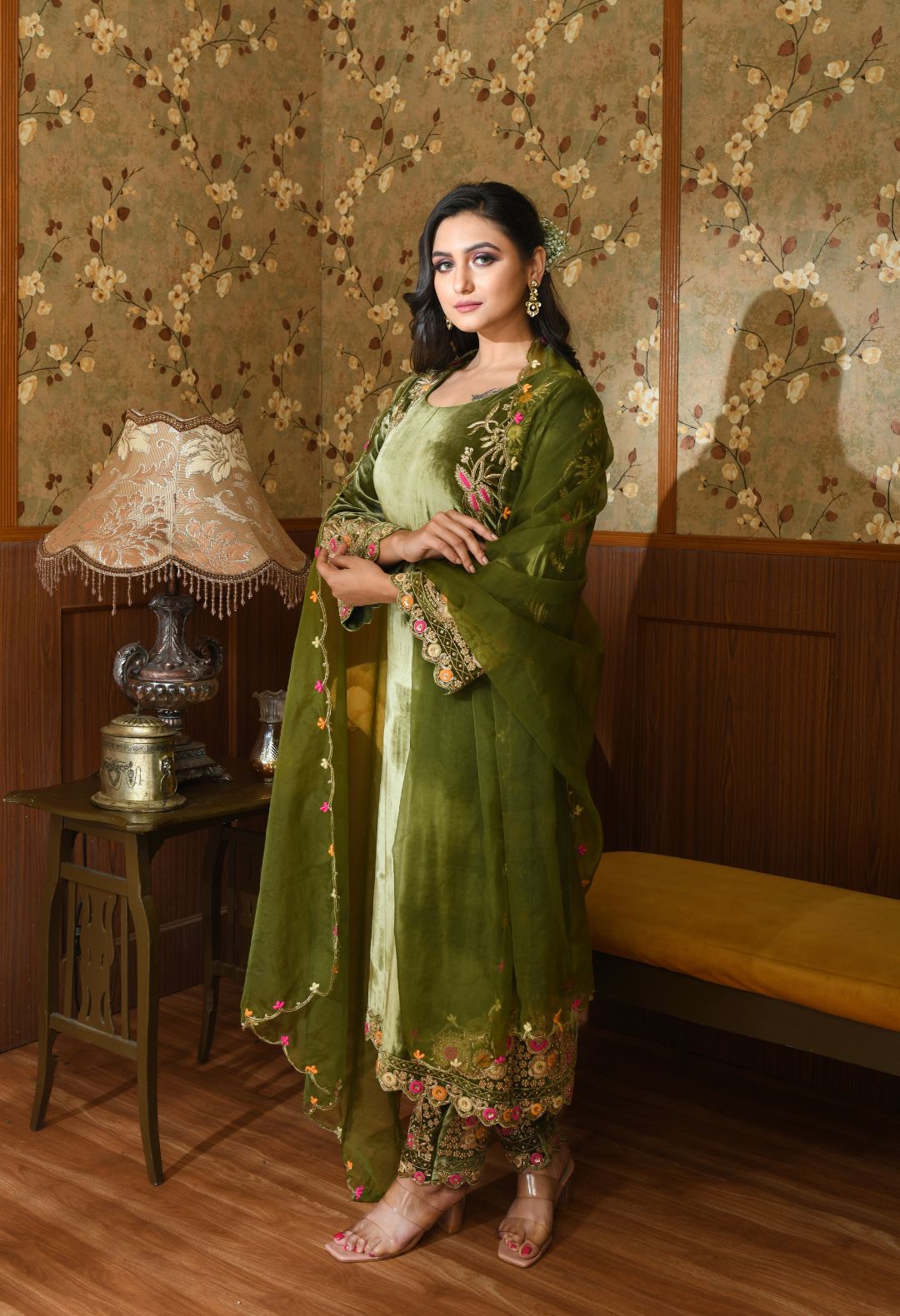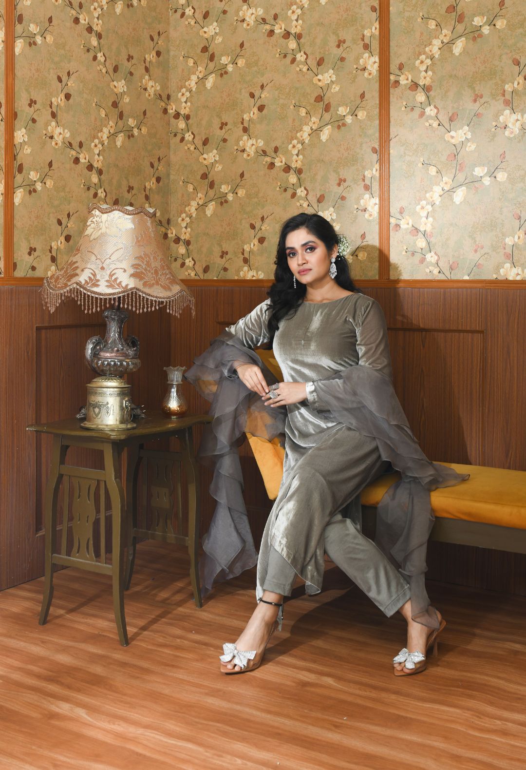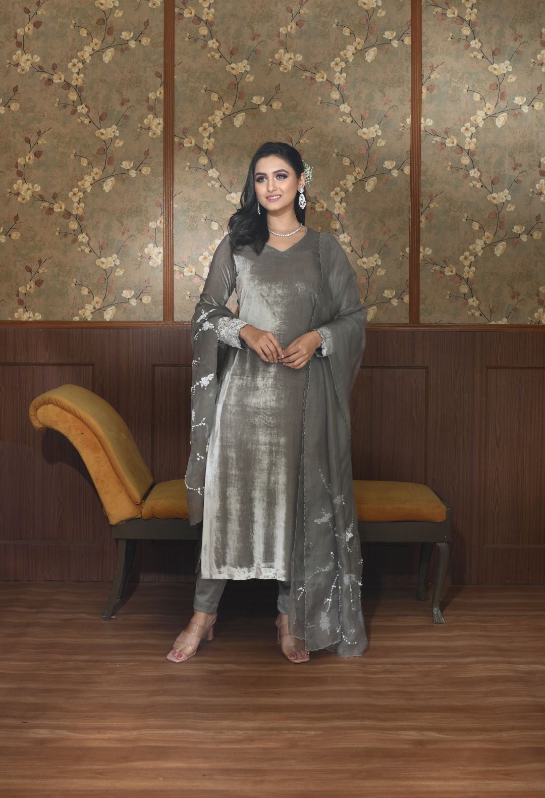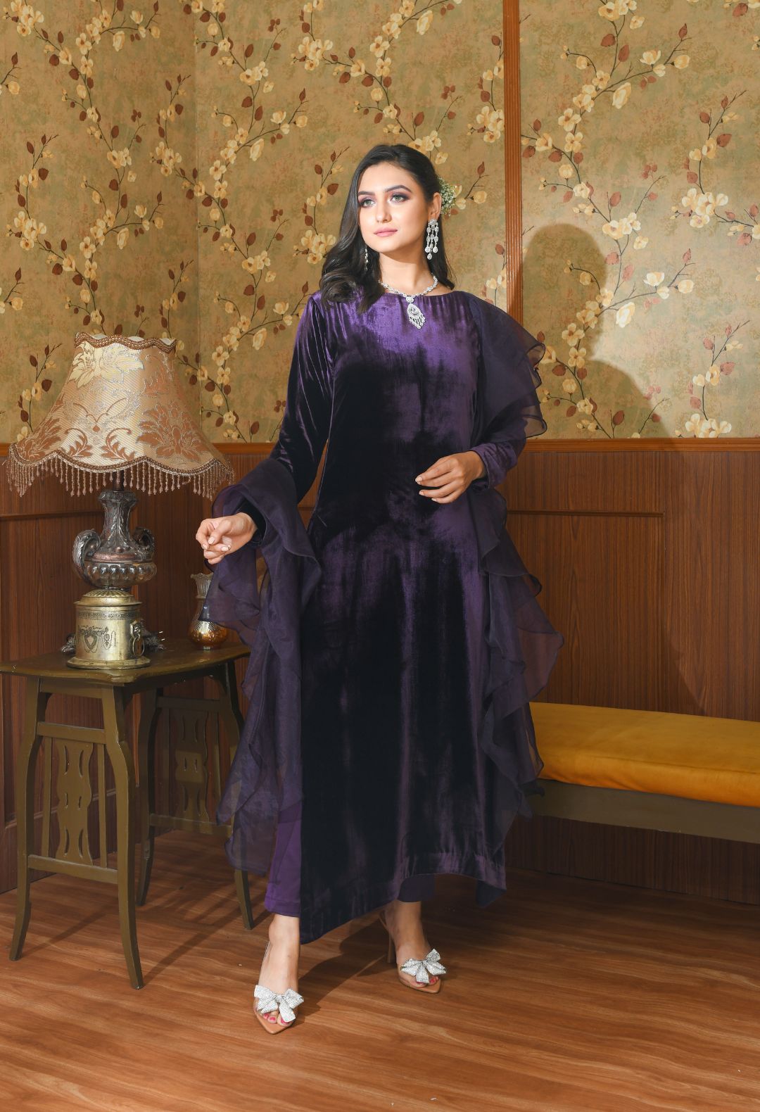 Premium velvet suit with an intricate detailing on the sleeves, paired with an emroidered organza...