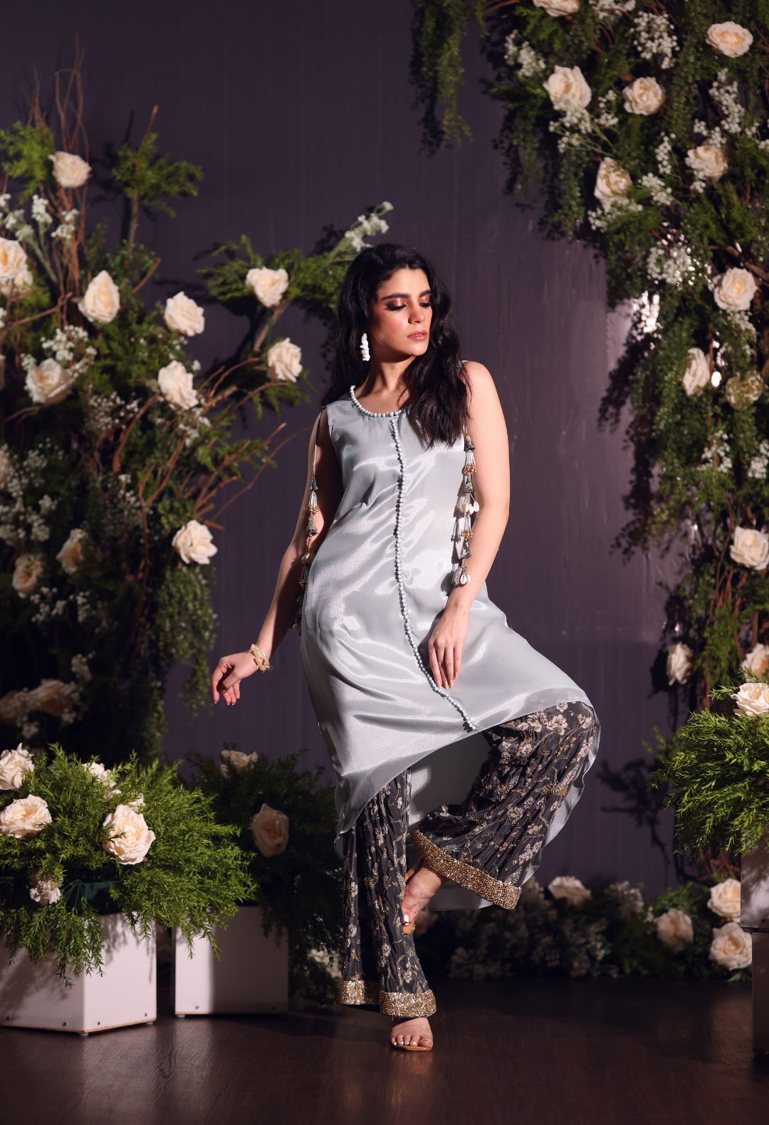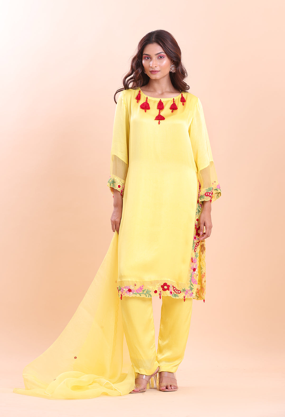 Broad neck and bell sleeves organza overlay with tassel detailing paired with a classic bottle...