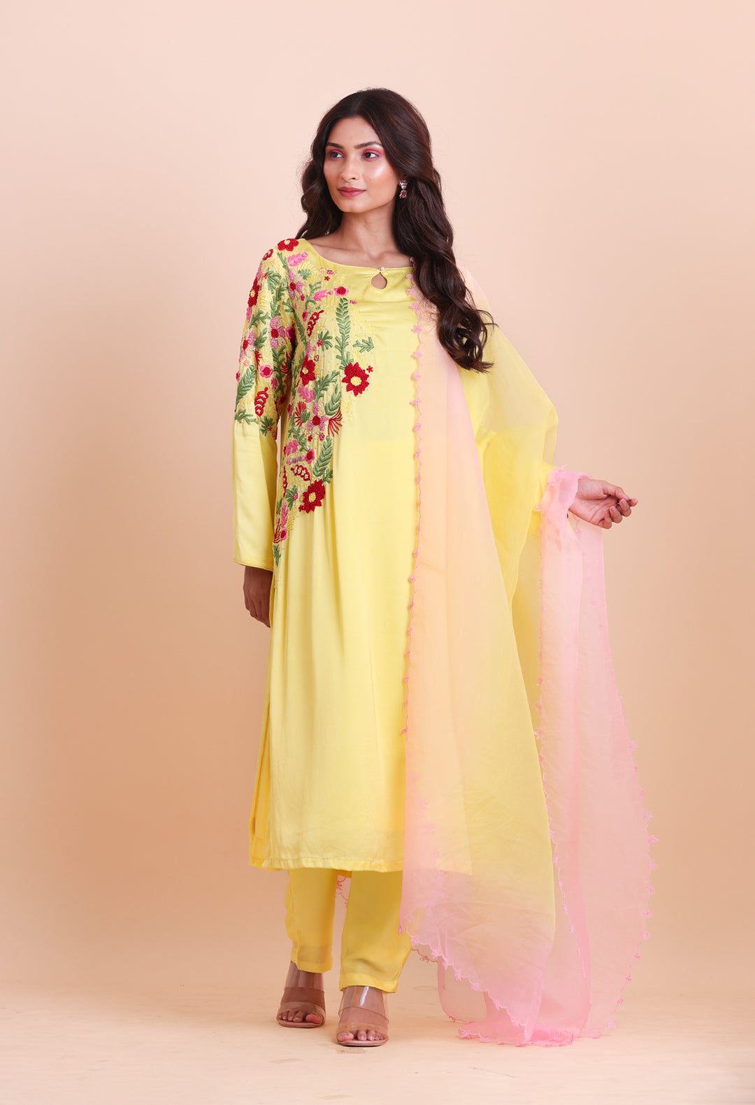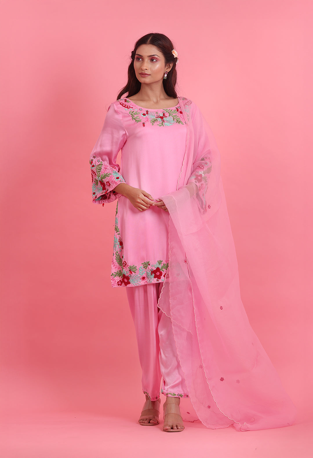 Modal satin kurta set with intricate threadwork and pearls embroidery.Comprises: Kurta, pants and dupattaFabric: Kurta...