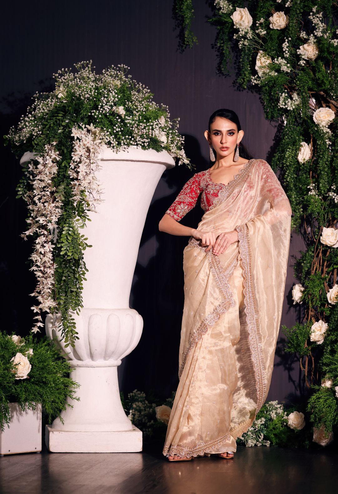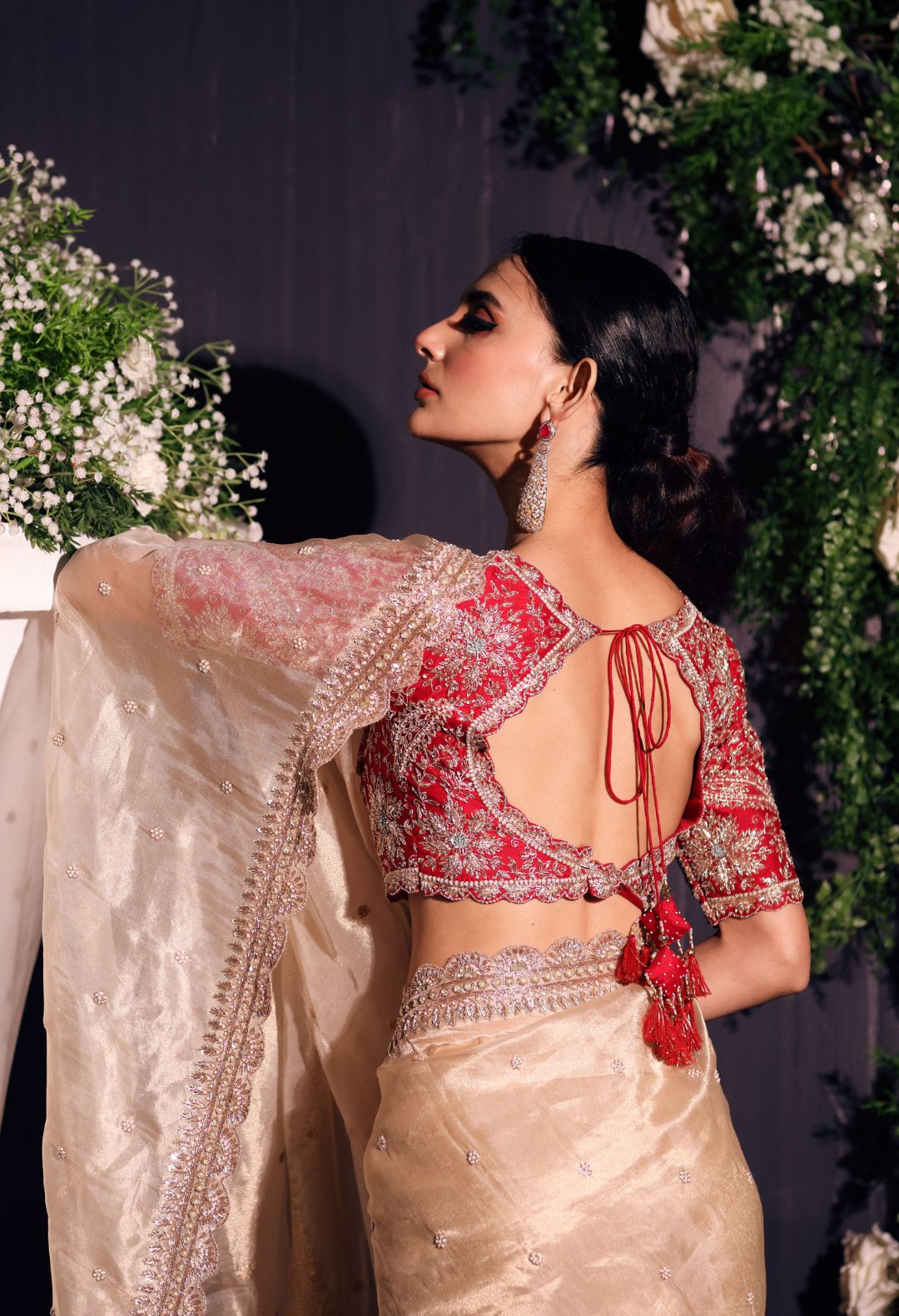 Gold tissue organza saree with intricate all over embellishment paired with a red statement blouse. This outfit features Zari and dabka hand embroidery.