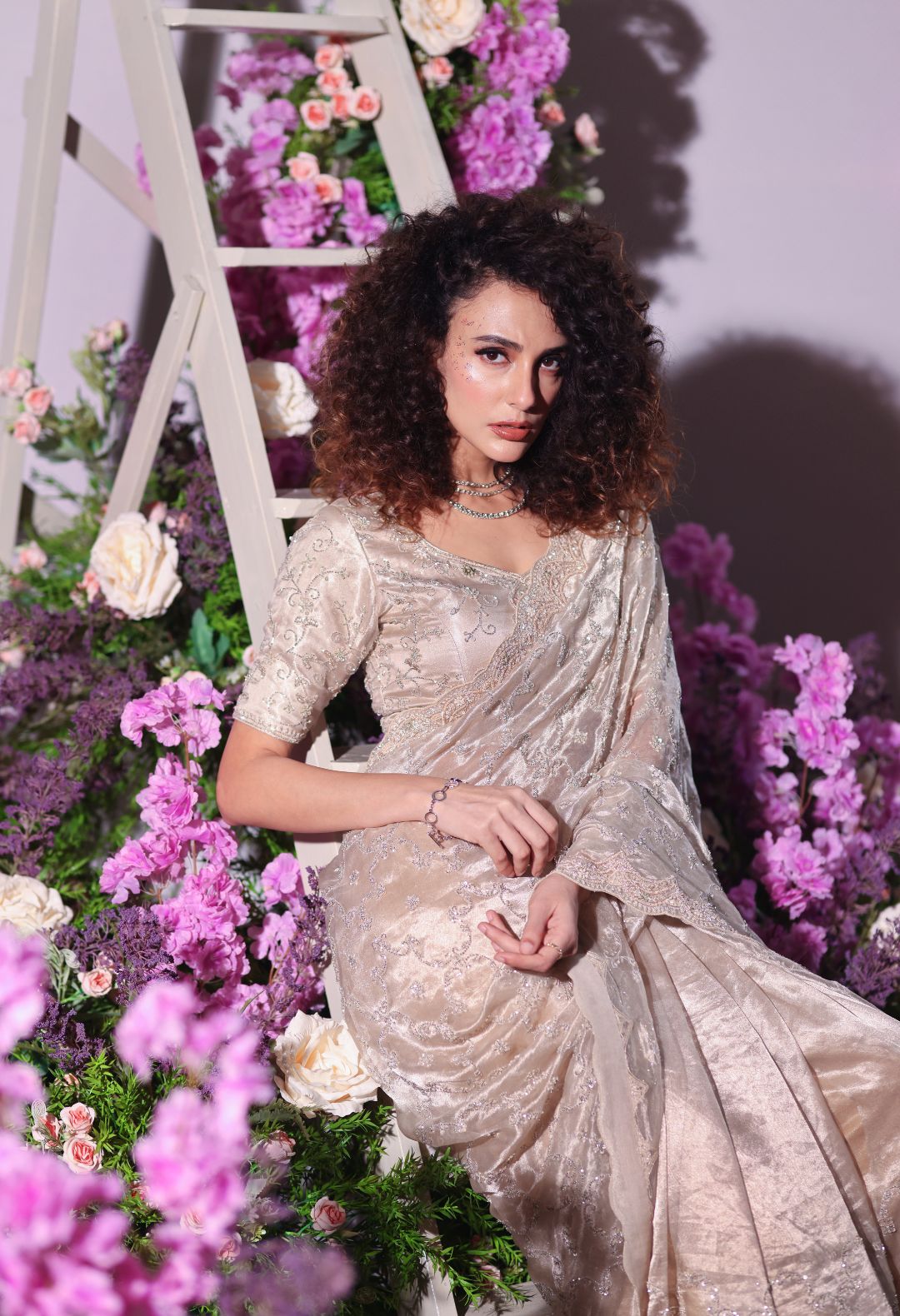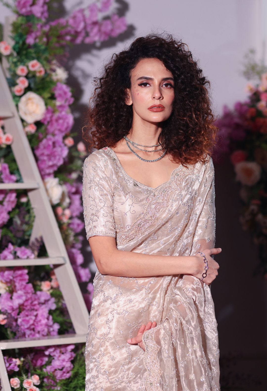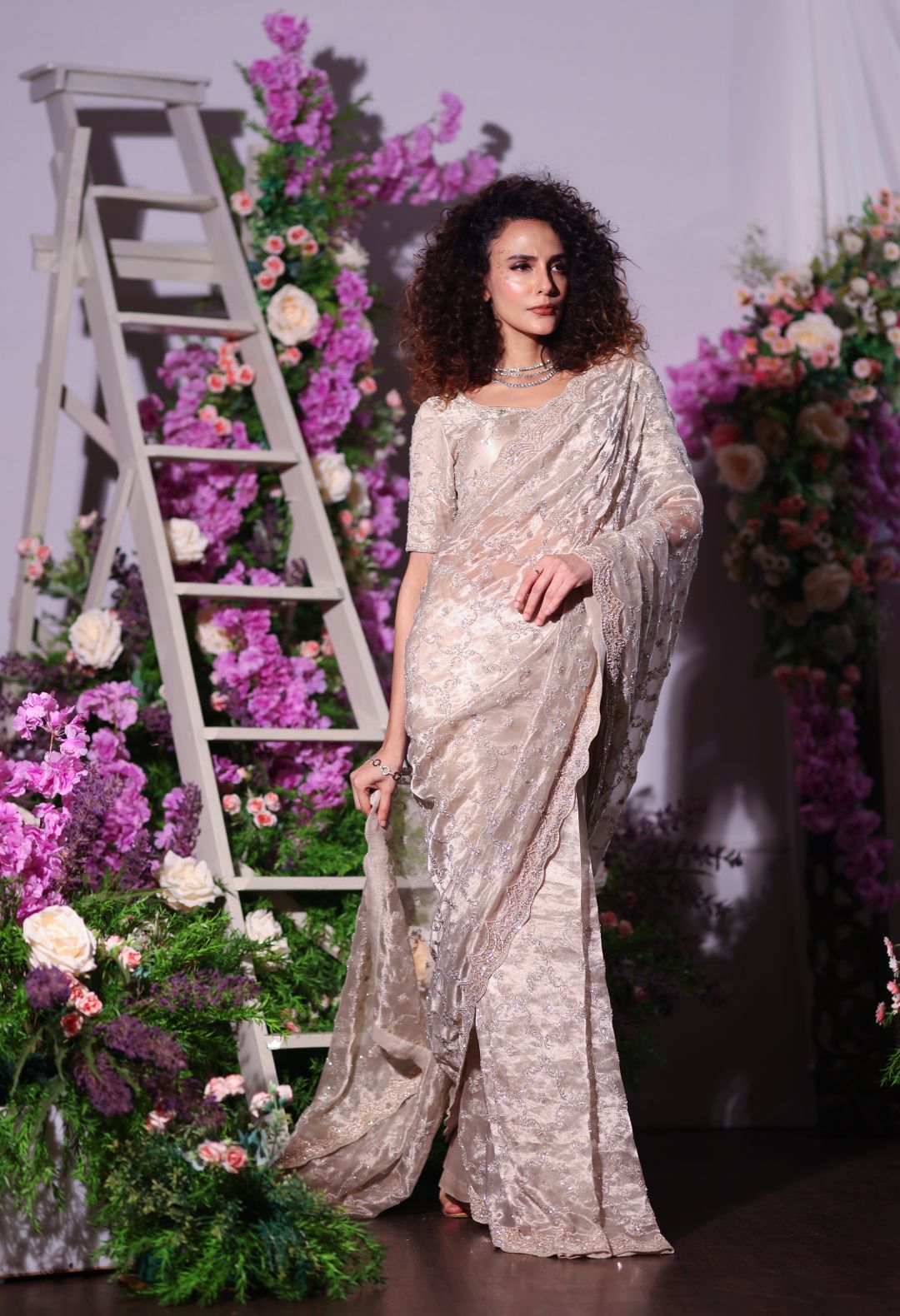 Organza saree with classic cutdana jaal detailing all over along wih monochrome blouse.